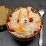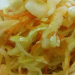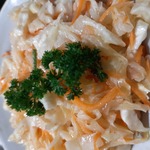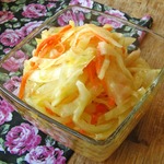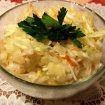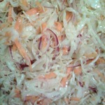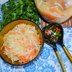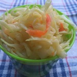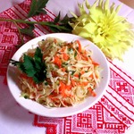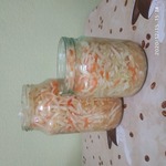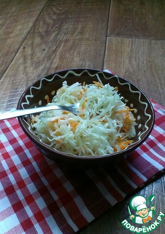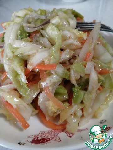Добавляла красный болгарский перец, очень гармонично вписался. Похожую капусту у нас продают в отделах с корейскими салатами и стоит она рублей 20-25 за 100 гр.