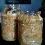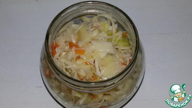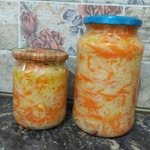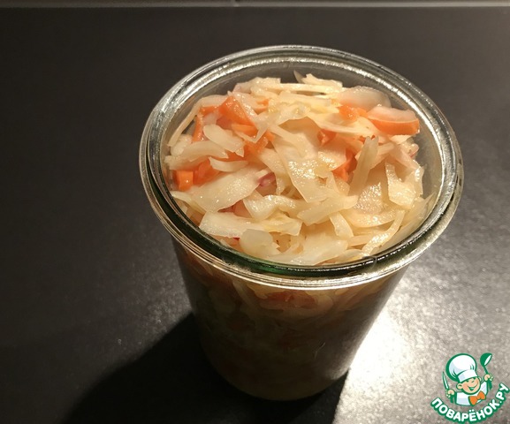 Содержимое кастрюли можно переложить в стеклянную банку и убрать в холодильник. Наилучшего вкуса, по моему мнению, капуста набирает на второй-третий день. Но уже и на следующий день все с удовольствием начинают таскать ароматную капусту из банки. Из половины нормы получается двухлитровая банка капусты.