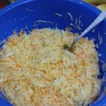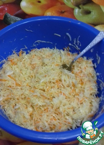 Капусту, морковь и лук складываем в глубокую емкость и перемешиваем. Обычно я делаю половину указанной нормы, тогда нашинкованный объем занимает 4,5 литровую кастрюлю.