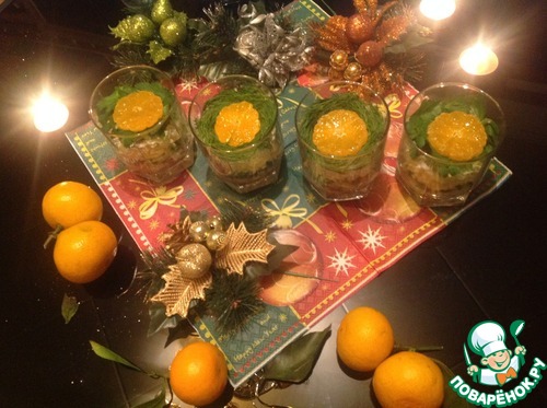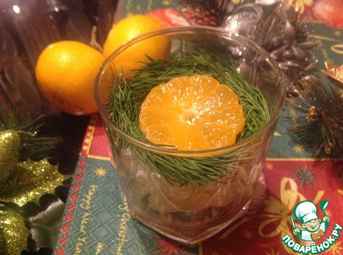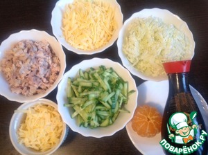 В порционные бокалы уложить слоями подготовленные ингредиенты, промазывая каждый слой заправкой, в следующей последовательности: куриное филе, огурец, сыр, пекинская капуста (или листья салата). Сверху мандарин. Поставить в холодильник на пару часов, украсить зеленью и подать к столу.
