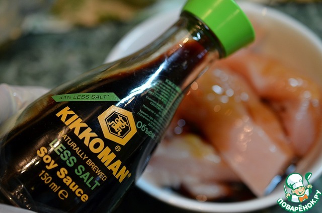 Полить соевым соусом ТМ Kikkomаn и оставить минут на 15.
