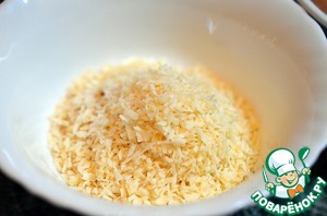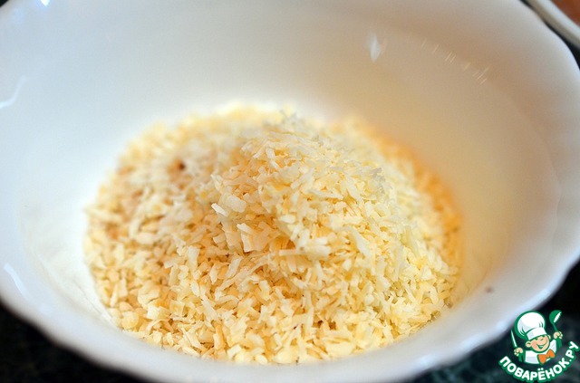 Панировочные сухари смешать с кокосовой стружкой, добавить чесночный порошок.