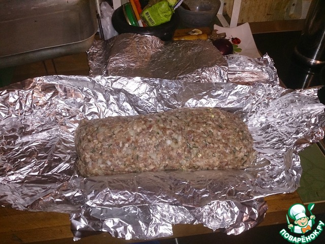 Начинаем скручивать рулет. Аккуратно, приподнимая фольгу, фарш начинаем