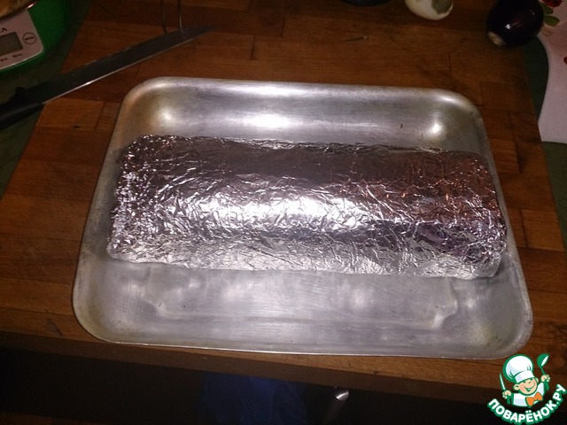 Когда рулет скрутили, взять еще кусок фольги и подложить под низ, получилось крест-накрест, закрутить верхний слой фольги, затем нижний, что бы получился герметично скрученный рулет.