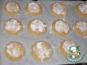 Из теста сформировать печенье и выложить на противень, застеленный пергаментной бумагой, сверху присыпать сахарной пудрой и выпекать при 150 градусах 20-25 минут до румяных краев. Печенье лучше делать потоньше, 7-8 мм толщиной.