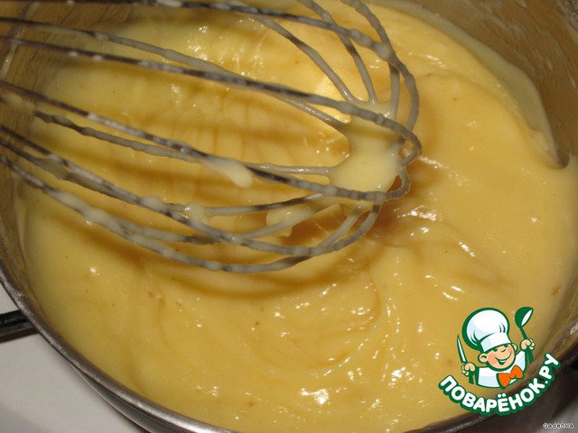 Затем тонкой струйкой влить очень горячее молоко, постоянно помешивая. Затем поставить на очень медленный огонь, не переставая мешать венчиком, сгустить массу до появления первых пузырьков, выключить. Полностью остудить.
