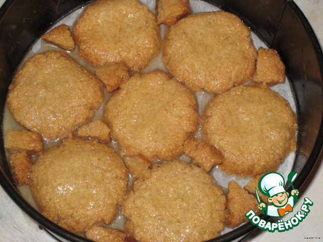 Печеньки окунуть в сок на 20-30 сек. и выложить одним слоем на дно формы.