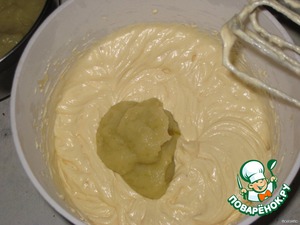 Масло взбить с сахарной пудрой в легкую белую массу, затем в 3-4 приема ввести яичный крем, хорошо взбить, затем ввести яблочное пюре, перемешать.