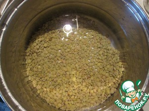 Язык необходимо отварить и почистить заранее. Чечевицу залить водой и оставить на 30-40 минут. По истечении нужного времени воду слить, залить чечевицу 2,5 литрами холодной воды, поставить на огонь. довести до кипения.