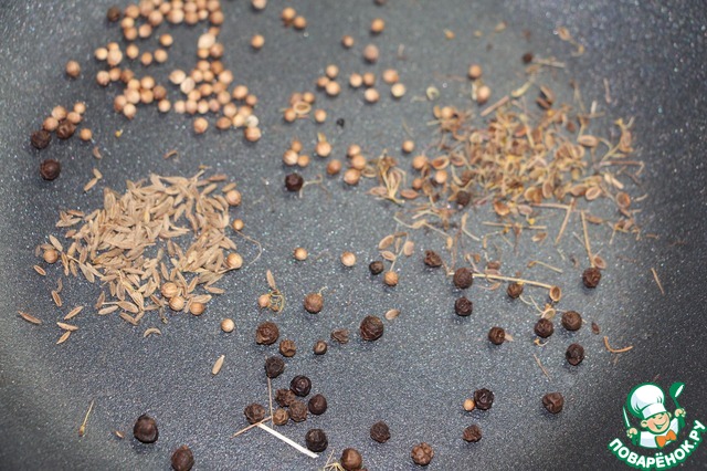 Кориандр, перец горошек, семена укропа и зиру прокалить на сухой сковороде.