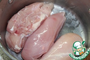 Заранее замариновать и приготовить куриную грудку. Такая грудка, тоненько нарезанная, хороша и на бутерброды