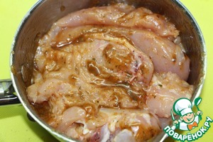 Хорошенько обмазать получившейся массой куриное филе. Оставить в маринаде минимум на 2 часа, лучше на 12 часов.