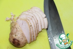 Остывшую грудку нарезать тонкими ломтиками. Кстати, весьма неплохо класть ее на бутерброд вкупе с листьями салата, например.