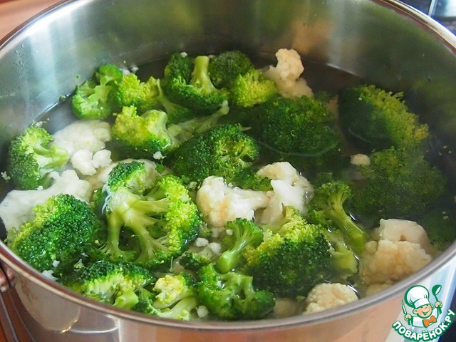 Небольшого размера цветную капусту и брокколи разобрать на соцветия и отварить в подсоленной воде до мягкости.