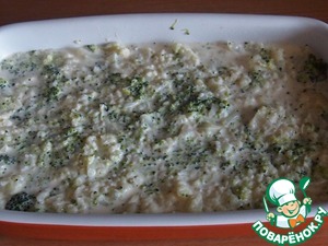 Отваренную капусту откинуть на дуршлаг, разложить в форму для запекания и залить заливкой. Размер формы зависит, конечно, от размера капусты, у меня форма 18 х 28 см. Вилкой немножко придавить капусту, чтобы она была покрыта заливкой.
