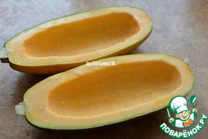 Кабачок хорошо помыть и разрезать пополам вдоль, делать это нужно осторожно, так как кожура у кабачка очень твердая, а нож острый;