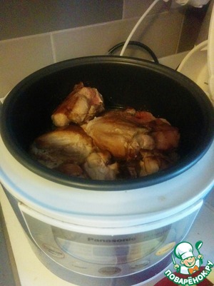 Складываем мясо в мультиварку оставляем его и тушиться в течении часа без воды.