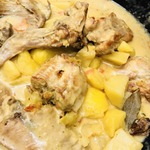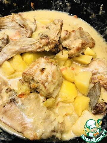 Наше мясо тушиться уже час. По истечении часа добавляем к кролику картошку и заливаем соусом Бешамель.