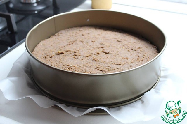 Разъемную форму для выпечки застелить пергаментной бумагой, а бортики смазать сливочном маслом. Печенье раскрошите, добавьте сливочное масло, какао порошок и взбейте миксером в однородную массу. Выложите в форму, разровняйте поверхность и поставьте в разогретую до 180 °С духовку на 10 мин. Выньте, остудите (духовку не выключайте).