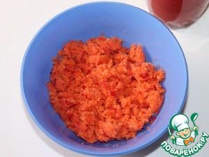 • Измельчите овощи блендером. Выжмите сок из овощей. Я выжимала при помощи марли, получилось 250 мл. 0,5 стакана оставляем для соуса.