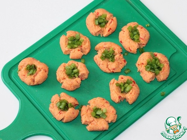 • Примните пальцем середину шарика и положите 0,5 ч. л. зеленого лука.