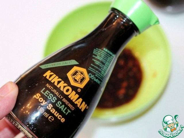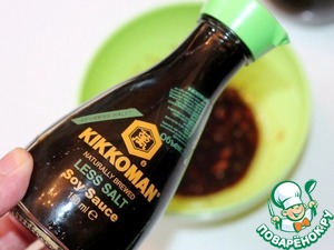 • Приготовим соус. Смешиваем масло, соевый соус, выдавленный чеснок, имбирь, измельченный сладкий перец, уксус и соус чили.