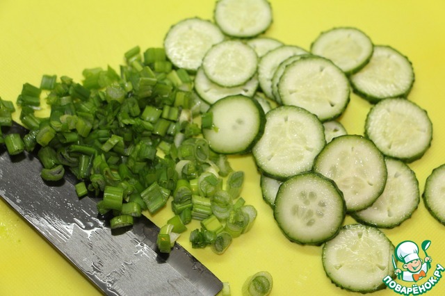Огурцы порезать кружочками, зеленый лук измельчить.