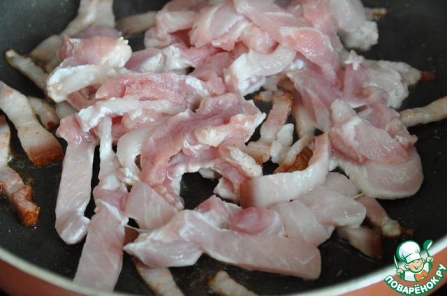 Бекон (у меня варено-копчёный) режем тонкими полосками и выжариваем на сковороде. -