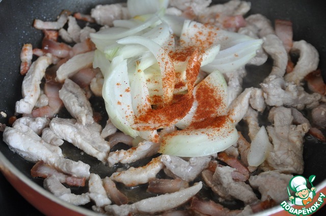 Добавляем порезанный перьями лук и порошок паприки, тушим до мягкости лука.