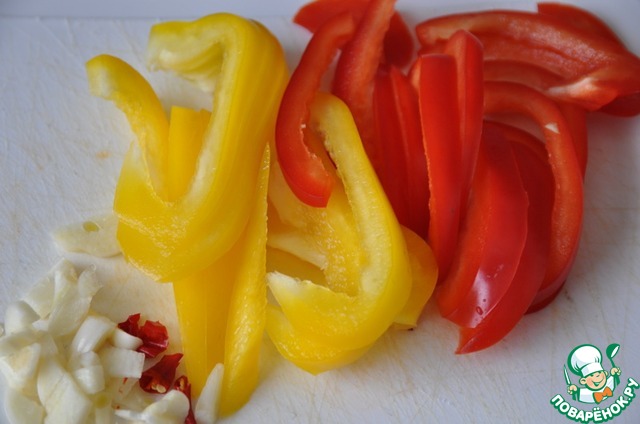 Овощи моем, чистим. Перец режем тонкими полосками, чеснок кубиками, перец чили мелкими колечками. Кладём овощи к мясу и тушим 5 минут на медленном огне.