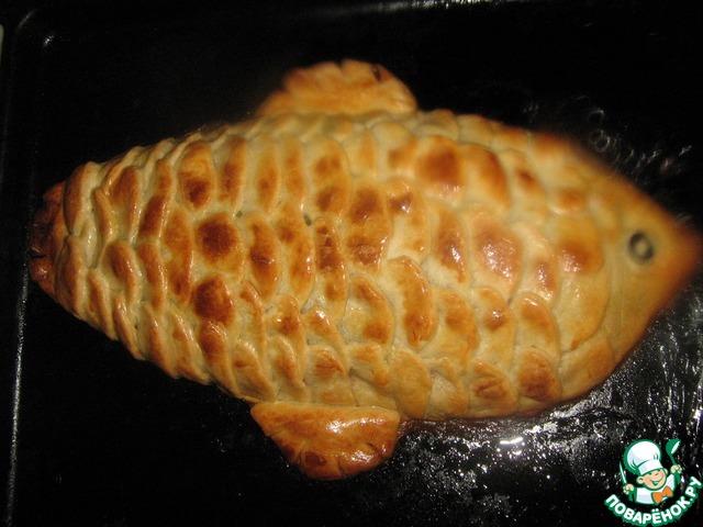 Половину слоеного бездрожжевого теста раскатать толщиной 0,5 см. Вырезать овал. Уложить на смазанный подсолнечным маслом противень - это будет "брюшко" рыбы - пирога.