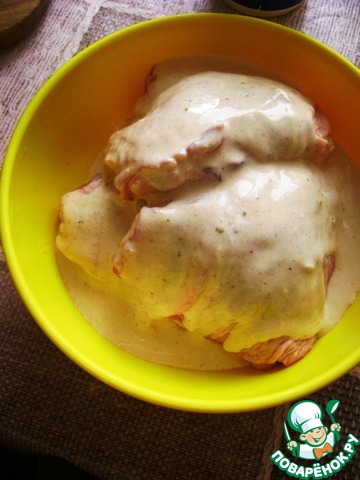 Промыть и обсушить бедра. Уложить в неокисляемую миску и залить йогуртом, смешанным с половиной карри и паприкой. Чуть присолить. Оставить на столе на час.