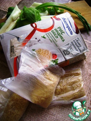 Сварить рис. Рис в пакетиках от Мистраль удобен, требует мало воды для варки и варится совершенно без присмотра. Просто следуйте указаниям на коробке.