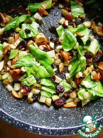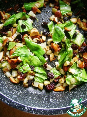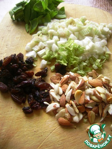 Нарезать мелко стебель сельдерея, покрупнее шпинат. Орехи я оставила в кожице – так ароматнее. Вместо заявленного миндаля я положила абрикосовые ядрышки…импортозамещ ение, что поделать. Орехи лучше разрезать пополам. Изюм промыть и обсушить.