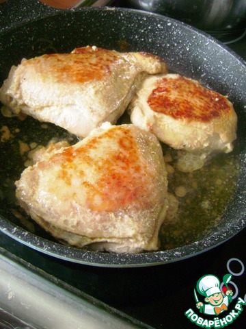 Окорочка отряхнуть от излишков маринада, маринад сохранить. Разогреть сковороду с антипригарным покрытием и выложить окорочка шкуркой вниз. Жарить на среднем огне до подрумянивания кожицы. Перевернуть и тушить, накрыв крышкой.