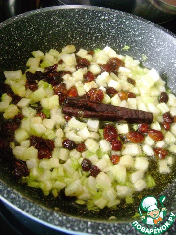 Разогреть в сотейнике топленое масло. Выложить сельдерей и изюм. Обжарить с палочкой корицы до легкой золотистости.