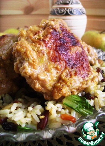Подавать рис горячим, уложив сверху окорочка и полив яблочной подливкой.