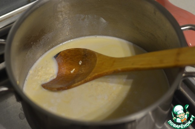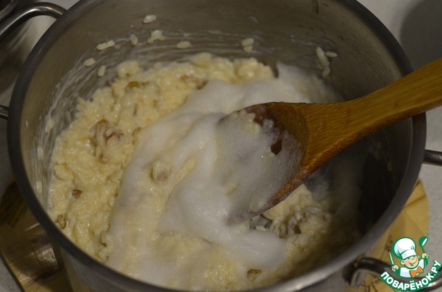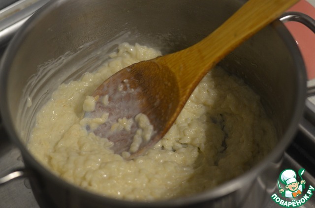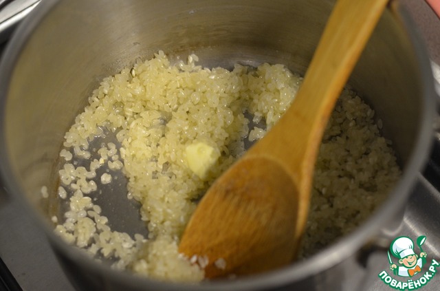Добавляем молоко и томим на медленном огне минут 5, для того чтобы рис стал слегка мягким.