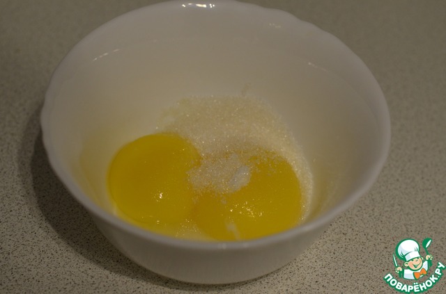 Тем временем отделяем желтки от белков и смешиваем их с сахаром. Так же замачиваем изюм в теплой воде.