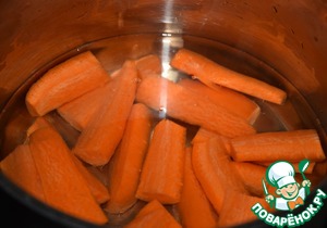 Морковь очистить, нарезать брусочками и отварить небольшом количестве воды до мягкости. Слить воду, остудить.