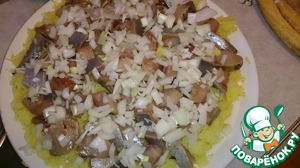Вторым слоем укладываем заранее очищенную и порезанную на кусочки селедочку и мелко порубленный лук.