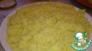 Первый слой. Натираем вареную картошку на мелкой терке, укладываем на тарелку и ни в коем случае не приминаем, слой должен быть воздушный.