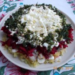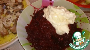 Третьим слоем свекла. Ее натираем на мелкой терке, я немного присаливаю, и соединяю с майонезом (делаю свой домашний майонез, другой не применяю)