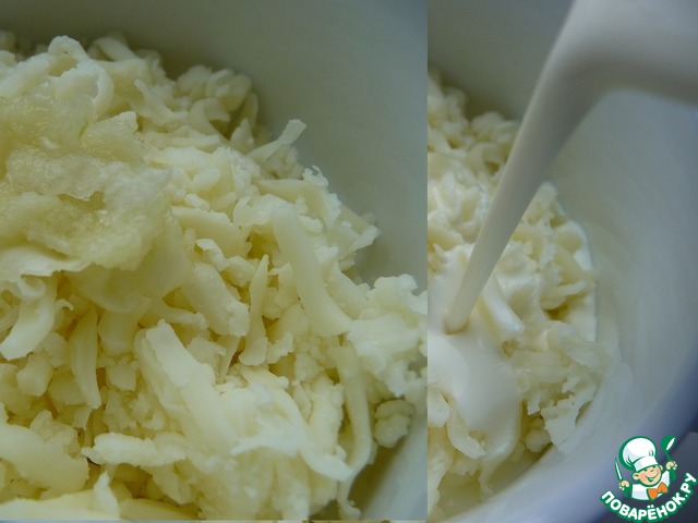 Готовим заливку. В натертый сыр добавить чеснок (выдавленный через пресс), добавить сливки, слегка присолить. Можно взять любой твердый сыр, но с солью быть аккуратней.