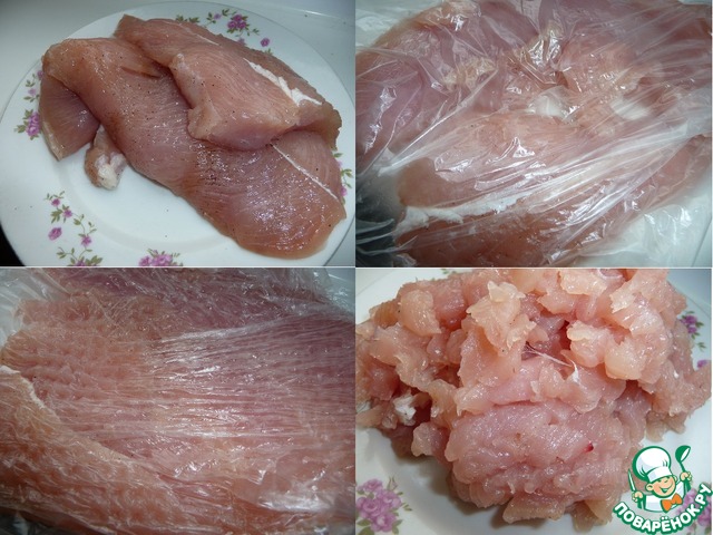 Филе индейки (у меня немного присоленное и приперченное) слегка отбить. Удобнее это сделать в мешке или под пищевой пленкой. И мелко нарезать.