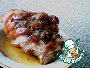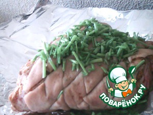 Прокалываем тонким ножом "мясистую" часть и в разрез пропихиваем ползубчика чеснока обмакнув его а соль. Всего 5-6 проколов. И все это ставим на полку холодильника на ночь. -