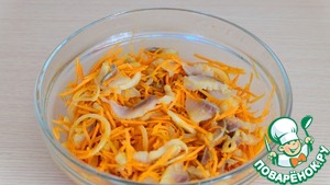 Соединить в миске нашинкованную морковь, колечки лука, добавить по вкусу соль, добавить горячее масло с уксусом. Смесь перемешать.