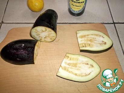 Баклажан разрезать поперек пополам, нарезать пластинами толщиной 0,5 см. Так удобнее будет подавать закуску. Пластины баклажана посолить, оставить на 30 минут.