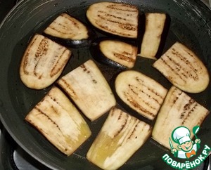 Ополоснуть проточной водой пластины баклажана, выложить на чистое кухонное полотенце, обсушить. В сковороде разогреть немного оливкового масла, слегка обжарить баклажаны с каждой стороны.
