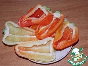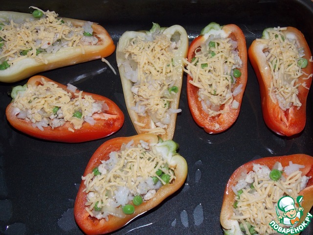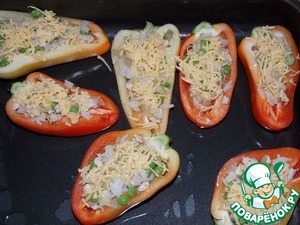Нафаршировать перцы начинкой. Сверху посыпать тёртым сыром. Запечь при 180С, 20-25 минут.